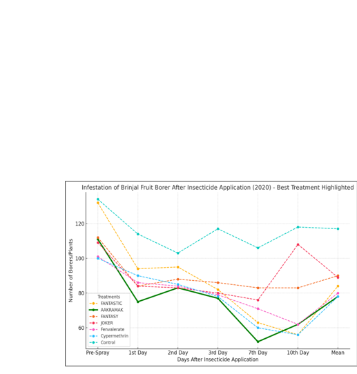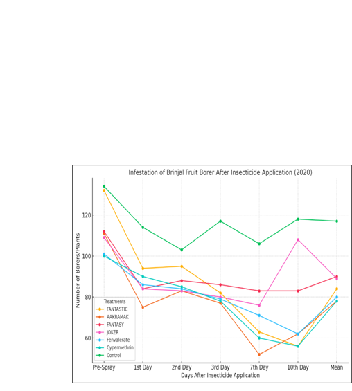 The effectiveness of various treatments against the brinjal fruit borer (Leucinodes orbonalis) has been thoroughly evaluated in this study. The results demonstrate that chemical treatments such as Cypermethrin, Fenvalerate, and AAKRAMAK provide significant control over pest infestation, with Cypermethrin emerging as the most effective among the tested options. The mean number of borers per plant for Cypermethrin was the lowest at 78, significantly reducing the infestation from a pre-spray count of 100. Fenvalerate also showed notable effectiveness, reducing the borer population to a mean of 80. The AAKRAMAK treatment reduced the infestation to a mean of 78, highlighting its strong performance in pest management. In contrast, FANTASTIC, JOKER, and FANTASY demonstrated lower levels of effectiveness, with mean borer numbers of 84, 89, and 90 respectively, indicating they are less effective compared to Cypermethrin and Fenvalerate. The Control group, which had no treatment, consistently showed the highest infestation levels, underscoring the importance of applying pest management strategies to reduce borer populations.